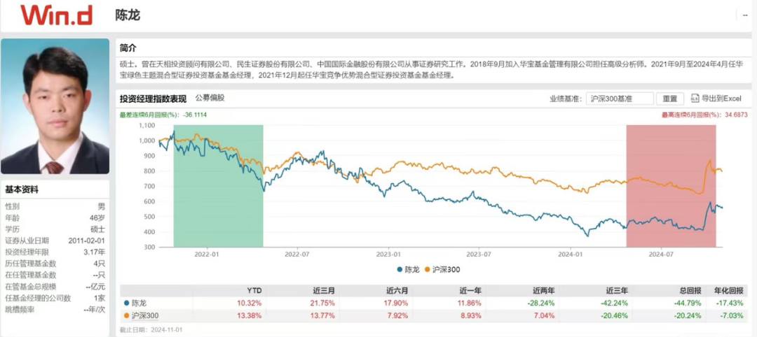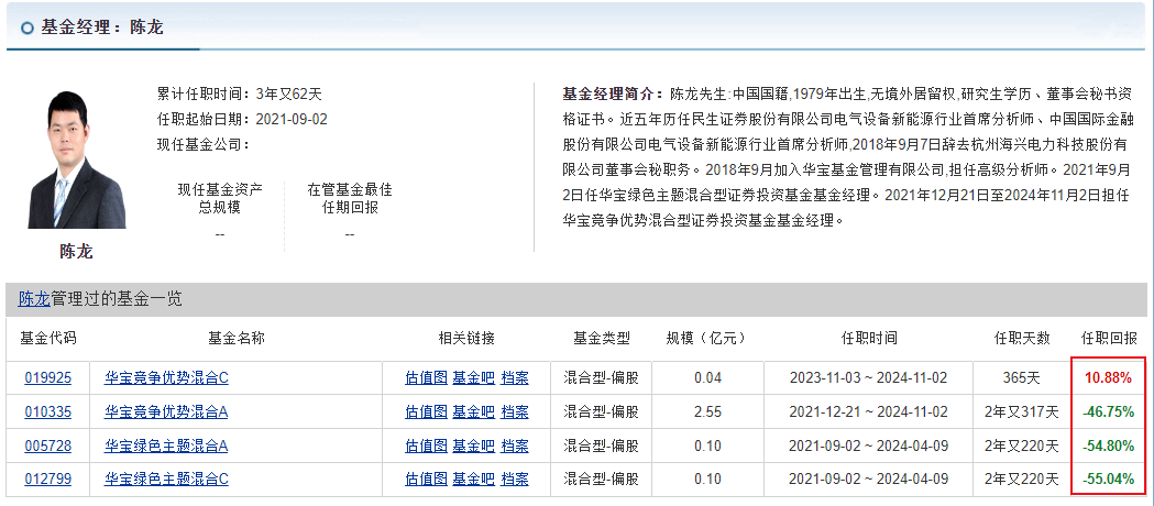 根据wind数据,陈龙曾在天相投资顾问、民生证券、中金公司从事证券研究工作。2018年9月加入华宝基金担任高级分析师。2021年9月至2024年4月开始管理华宝绿色主题混合型基金,2021年12月起任华宝竞争优势混合型证券投资基金基金经理。