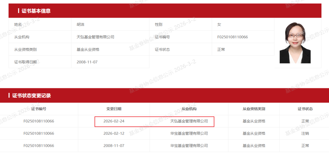 离职12天后,马年开年首个工作日,胡洁就正式加入天弘基金。