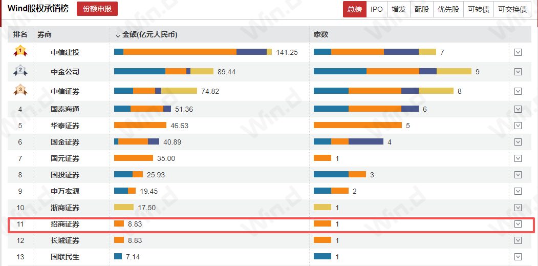 今年的承销表现,其又暂时落后去年第8的表现。截至3月3日,Wind2025年股权承销排行榜显示,招商证券承销金额8.83亿元,承销家数1家,排名第11。这远低于中信建投、中金公司、中信证券等券商。