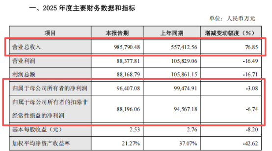 就在前述终裁结果落地前,影石刚刚交出了一份并不轻松的2025年业绩快报。去年,影石实现营业总收入98.6亿元,同比增长76.85%,但归母净利润下滑了3.08%,扣非净利润也下滑了6.74%,增收不增利。