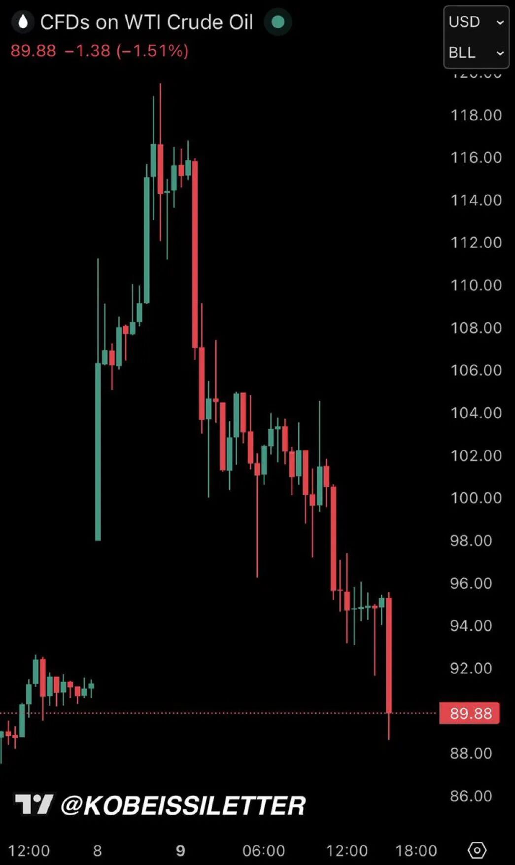 油市的反应更为剧烈。受霍尔木兹海峡运输风险与中东供应担忧推动,WTI原油期货周一盘中一度冲上119美元/桶上方;但在特朗普释放“战争快结束”信号后,油价迅速回吐涨幅。路透社收盘数据显示,WTI原油报88.07美元/桶,日内下跌3.11%;布伦特原油报92.41美元/桶,跌0.30%。CBS同日直播报道也显示,油价此前因战事升级显著飙升,而白宫表态缓和了市场对能源供应冲击的最坏预期。