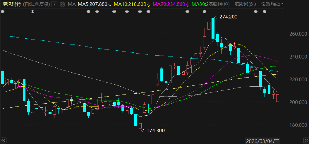 周一,泡泡玛特港股收跌0.58%,报206.2港元/股,盘中一度创出194港元/股的一个多月新低。