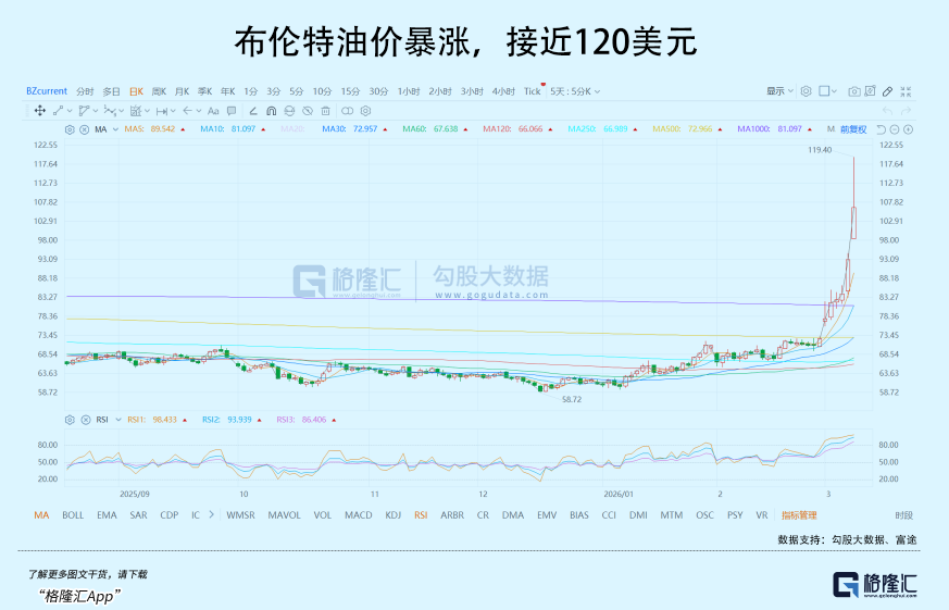 2022年俄乌战争爆发后,布伦特原油一度飙升至138美元,今天布油价格已经快摸到120美元,从这个角度看,确实有迈向当年的趋势。