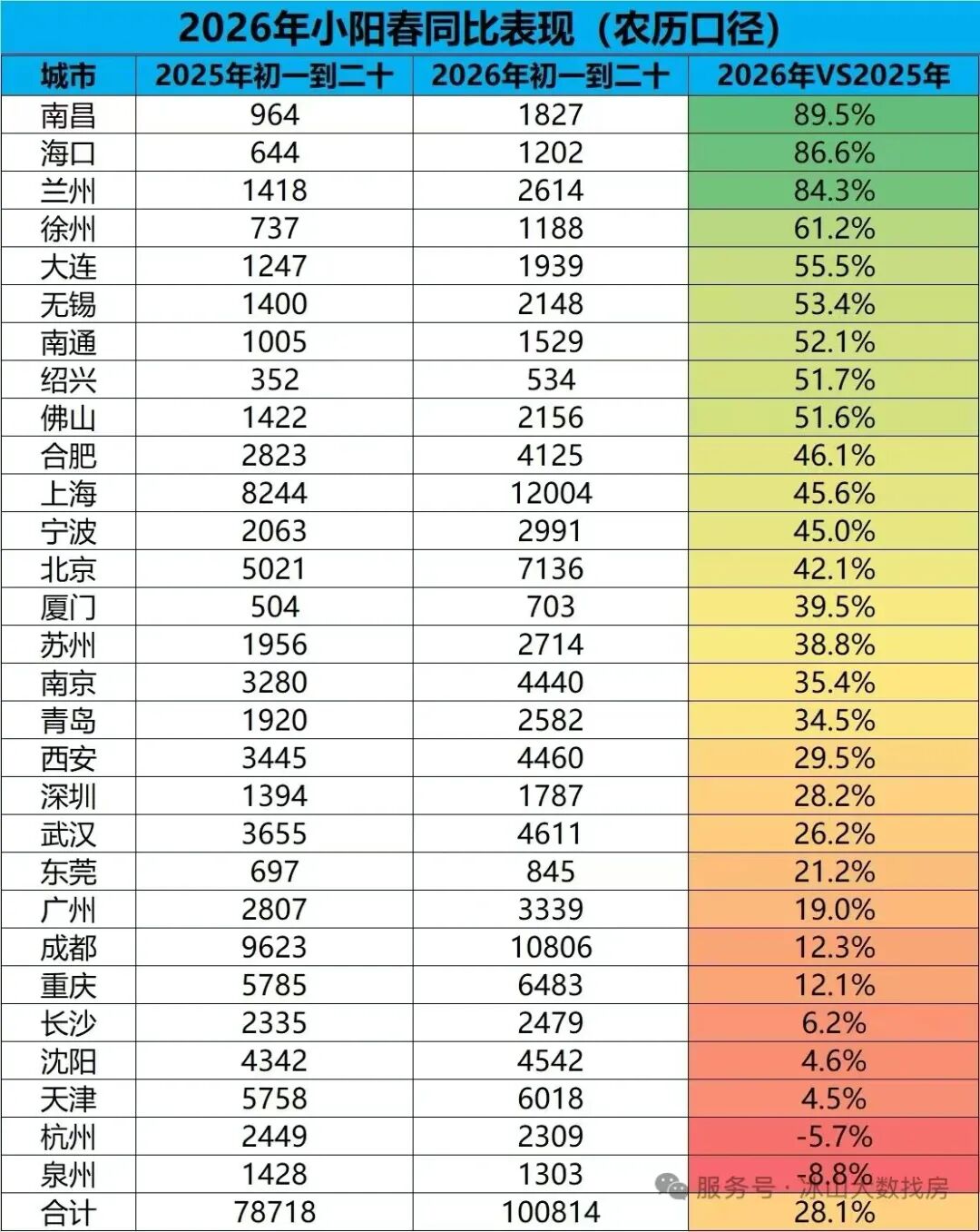 冰山数据显示,2026年正月初一到二十(2.17-3.8)期间,全国29城的二手房实时成交量(即定金量,是网签的领先指数≠网签量)同比大涨28%;尤其上海、北京、宁波、南昌、海口、兰州、合肥、大连、徐州、无锡、南通、绍兴、佛山,这13城的二手房实时成交量同比暴涨超40%。