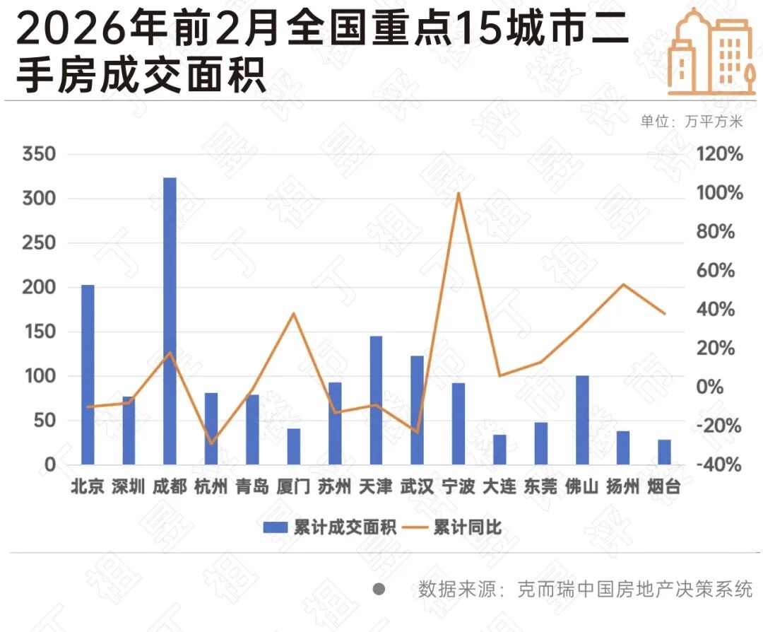 例如,成都2026年前2月二手房成交面积已经达到323.6万平方米,高居首位且同比增18%。