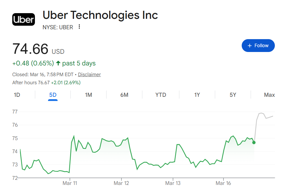 受此消息影响,优步股价收涨1.81%,报74.66美元/股,总市值1537亿美元,盘后股价继续攀升。