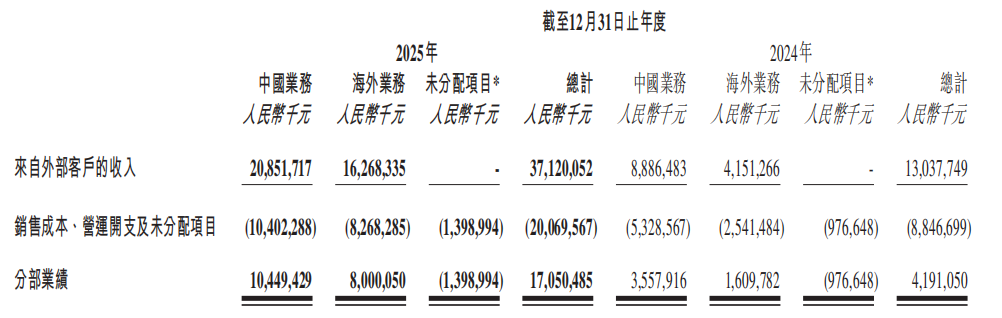 美洲线下收入由2024年的人民币3.796亿元增长到2025年的人民币22.355亿元,增长了488.9%。线上收入从2024年的人民币3.643亿元增长到2025年的人民币43.536亿元,增长了1,094.9%。