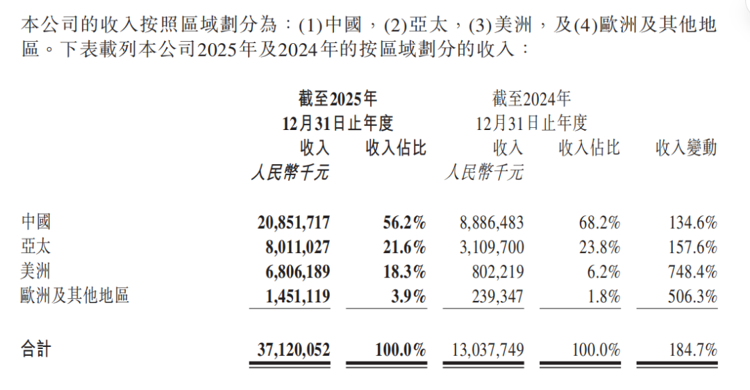 相反,美洲和欧洲及其他地区的收入疯狂上升,其中美洲地区收入同比增长748.4%,收入占比从2024年的6.2%提升到2025年的18.3%;欧洲及其他地区收入同比增长506.3%,收入占比从2024年的1.8%提升到2025年的3.9%。