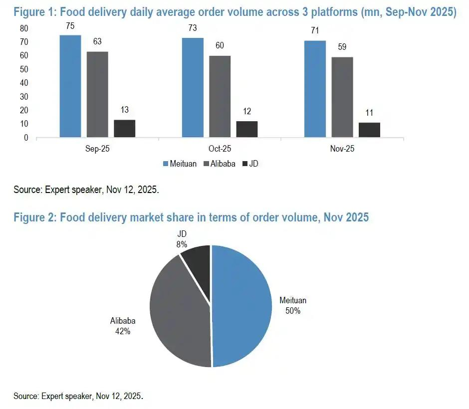 根据摩根大通2025年11月的调研数据,从订单量看,美团、阿里、京东三家的份额分别为50%、42%和8%。关键的GTV(总交易额)维度,美团稳定保持在60%以上的份额。