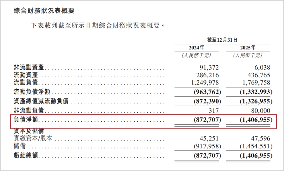 持续的亏损如同滚雪球一般,不断加剧新元素药业的财务压力,使其资产负债表状况日趋严峻。截至2025年12月31日,公司的负债净额已经高达14.07亿元,早已处于资不抵债的状态,并相较于2024年同期的8.73亿元,激增了61.2%。更为紧迫的是其短期偿债能力,流动负债净额从2024年底的9.64亿元增加至2025年底的13.33亿元,增幅达38.3%。而截至2025年底,其现金及现金等价物仅约1.85亿元。