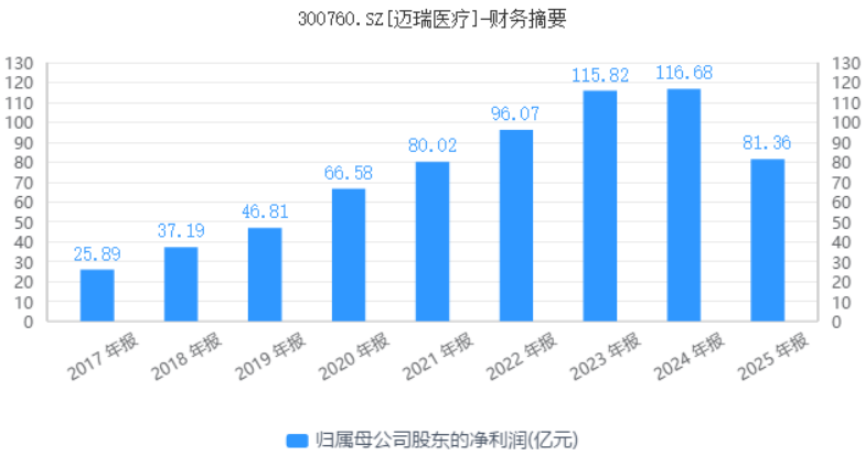 前不久,国内“医疗器械一哥”迈瑞医疗公布2025年年报。数据显示,2025年全年,迈瑞医疗营收332.82亿元,同比下滑9.38%;实现归母净利润81.36亿元,同比下跌30.28%。这也是迈瑞医疗自2018年上市以来,首次出现营收、净利润双双下滑的情形。从拉长周期来看,迈瑞医疗2025年净利润水平几乎是与2021年同期相当,几乎是一夜回到五年前。