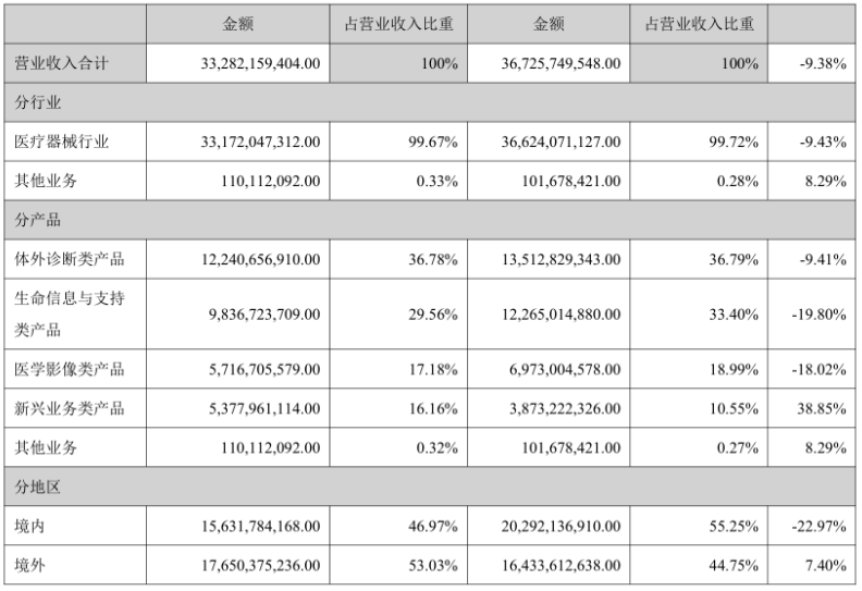 分区域来看,迈瑞医疗国内业务实现收入156.32亿元,同比下降22.97%,成为公司营收下滑的主要因素。对比看,迈瑞医疗国际业务实现收入176.50亿元,同比增长7.40%,营收增速较往年也明显放缓。