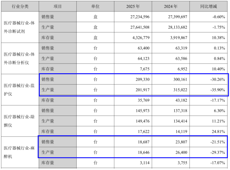 作为公司的起家业务,迈瑞医疗生命信息与支持这一业务也受到了医院整体资本开支预算收缩的影响。2025年全年,迈瑞医疗生命信息与支持产线实现销售收入98.37亿元,同比下降19.80%。从产销数据来看,生命信息与支持板块中的监护仪产品销售量、生产量同比降幅均超过30%,下滑幅度最大,主要系国内市场受医疗新基建项目的建设周期拉长以及公开招标至收入确认的周期延长等影响。