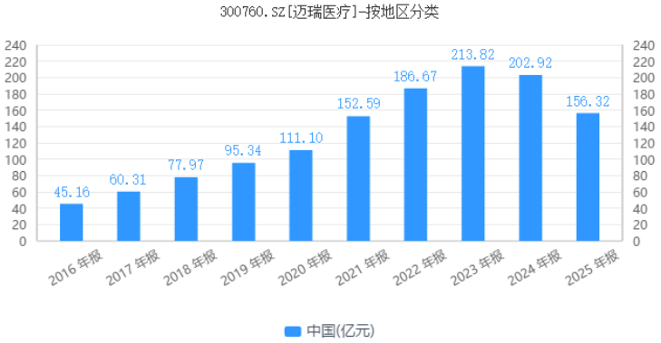 从拉长周期来看,迈瑞医疗国内营收已经连续三年出现同比负增长。数据显示,2023年-2025年,迈瑞医疗国内市场销售收入分别为213.82亿元、202.02亿元和156.32亿元,三年期间营收规模缩水57.5亿元。