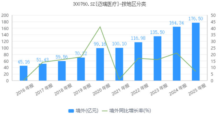 相比持续低迷的国内市场,迈瑞医疗海外市场表现尚可。2025年全年,迈瑞医疗国际业务实现收入176.50亿元,同比增长7.40%,国际收入占比提升至53%。其中,欧洲市场在2024年高增长的基础上,2025年进一步实现了17%的增长。