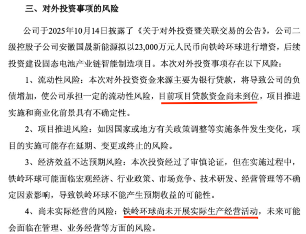 彼时,固态电池概念正热,国晟科技也因此迅速进入市场视野。但随后公司多次在风险提示中声明,该项目资金来源主要为银行贷款,项目贷款资金尚未到位,铁岭环球尚未开展实际生产经营,项目推进实施和商业化前景均存在不确定性。