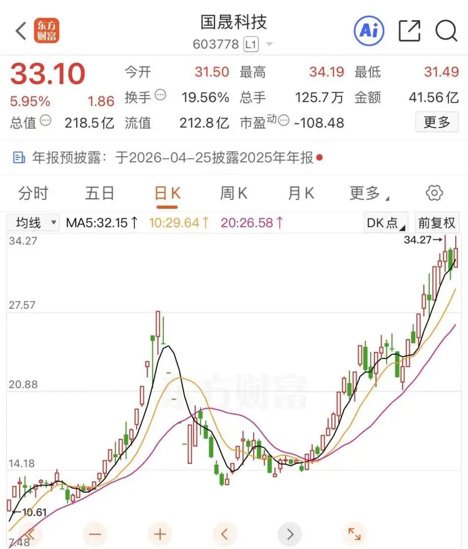截至2026年4月13日收盘,国晟科技报收33.10元/股,最新市值达218.5亿元。