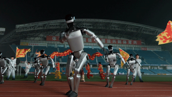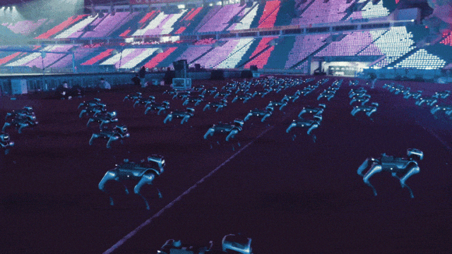 一边的人形机器人方阵要冲拳、空翻,另一边的四足机器狗方阵则要同步完成特技表演、协同编队,此类大型的表演编排和调度,考验的是机器人企业的群体控制与大规模协同能力。