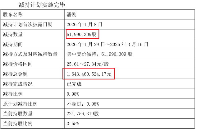 3月18日,伊利公布称,董事长兼总裁潘刚已经完成了减持,通过集中竞价交易的方式,共计减持6199.03万股,套现16.43亿。