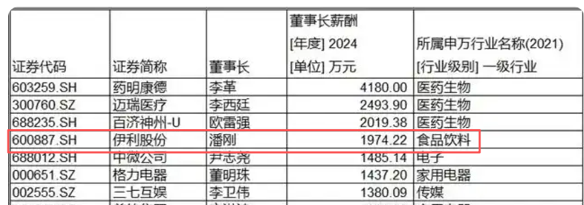 第一财经曾梳理过,2024年A股董事长薪酬排名,其中,潘刚就作为伊利股份董事长,以1974.22万元年薪位列第四。仅次于药明康德、迈瑞医疗、百济神州三大医药巨头,成功食品饮料行业唯一一个跻身“千万年薪俱乐部”的掌门人。