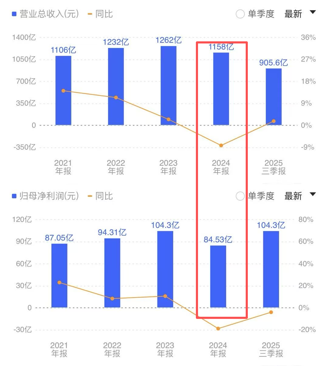 2025年前三季度,虽然营收重回增长,但净利润的下滑趋势却并没有所有改善,前三季度同比下滑4.07%至104.3亿。