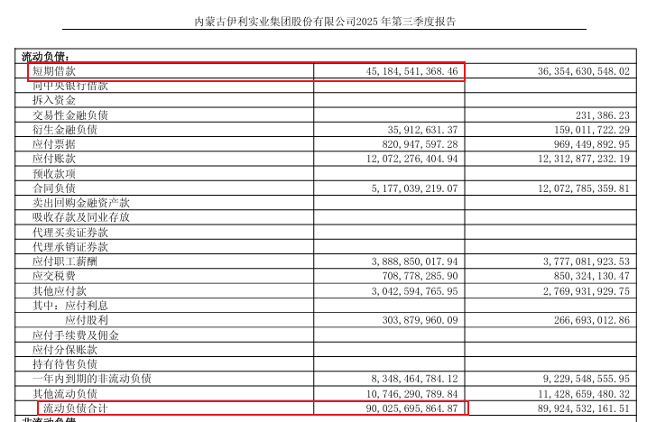 而到了2025年前三季度,伊利的债务压力依旧没有明显缓解。财报显示,尽管负债合计微降至924.77亿元,资产负债率60.55%,但其中流动负债高达900.26亿元,占比97.35%,短期借款451.84亿,短期偿债压力进一步集中。