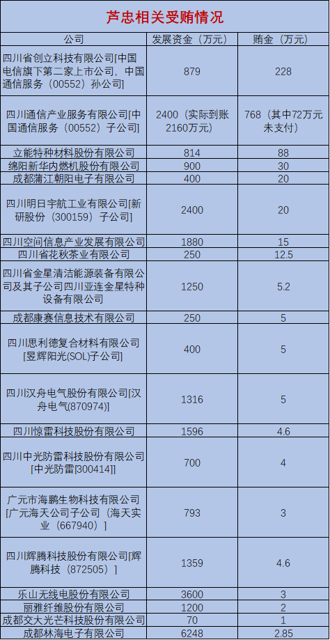 行贿的企业包括A股上市公司新研股份(300159)、港股上市公司中国通信服务(00552),中概股公司昱辉阳光(SOL),另有汉舟电气(870974)、海天实业(667940)等多家新三板、新四板公司卷入。