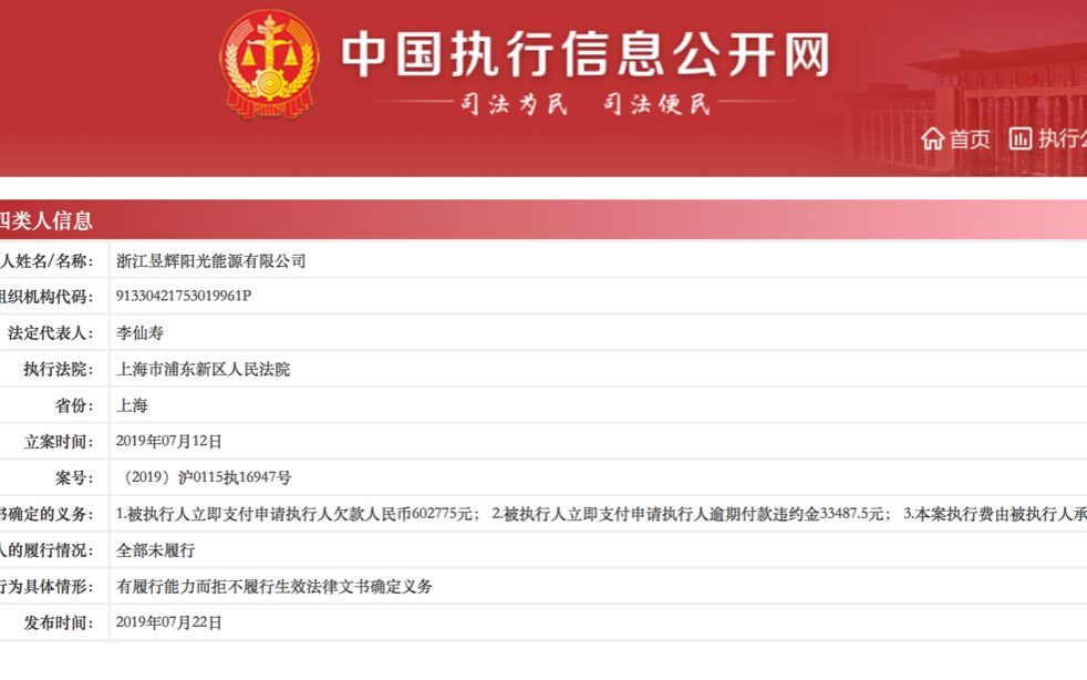 今年7月22日,昱辉阳光被列为失信被执行人,也就是“老赖”,执行法院是上海浦东新区人民法院,创始人李仙寿已被限制消费。