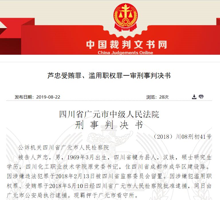 判决书显示,芦忠1969年3月出生,四川省犍为县人,硕士研究生学历,曾任四川经信委新兴产业推进处处长,2013年11月起任四川化工职业技术学院党委书记,住四川省成都市成华区建设路。