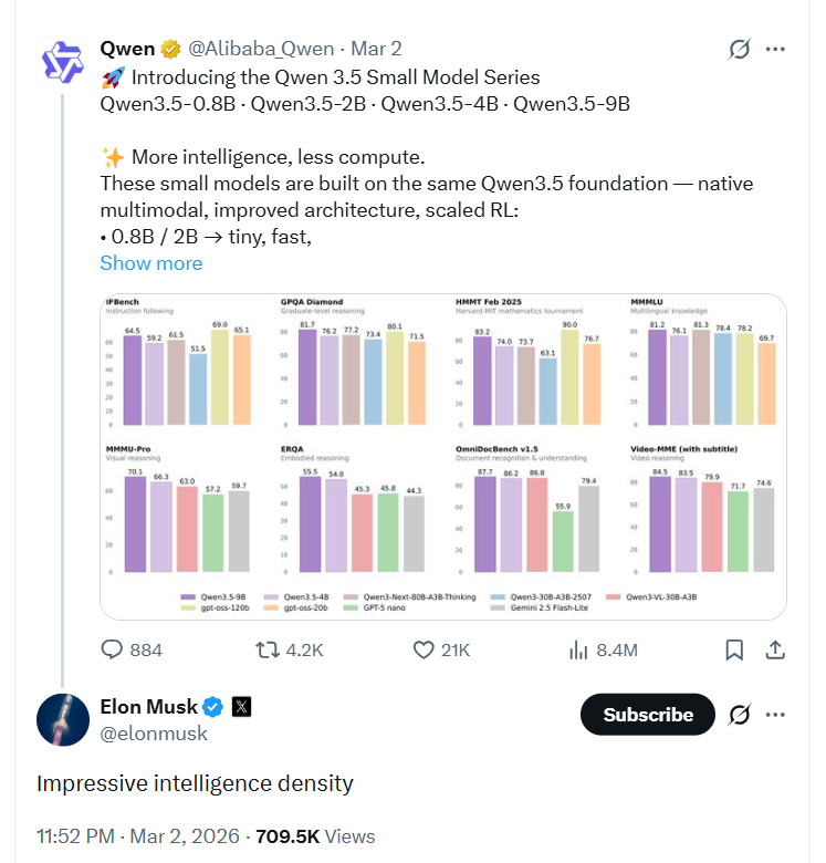 周一,千问在X上宣布推出了四款Qwen 3.5小模型——参数量分别为0.6B、2B、4B和9B——作为原生多模态模型,专为设备端AI和轻量级代理而设计。