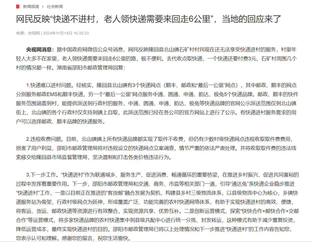 2024年11月14日,一位来自湖南邵阳的网民“无助的百姓”曾在中国政府网发帖反映说,他们隆回县北山镇石矿村村民,现在还无法享受快递进村的服务,村里年轻人大多不在家里,老人领快递需要来回走6公里的路,极不便利。去代收点取快递,一个快递还要付费3元,希望有关部门能关注这一类问题。