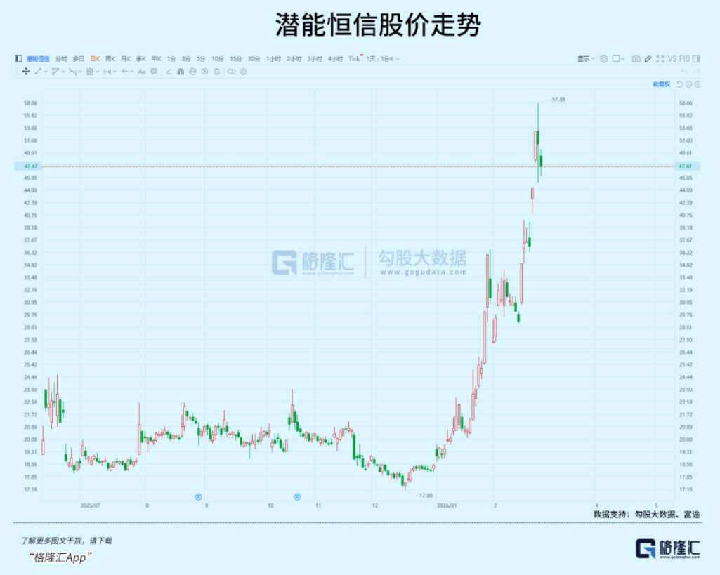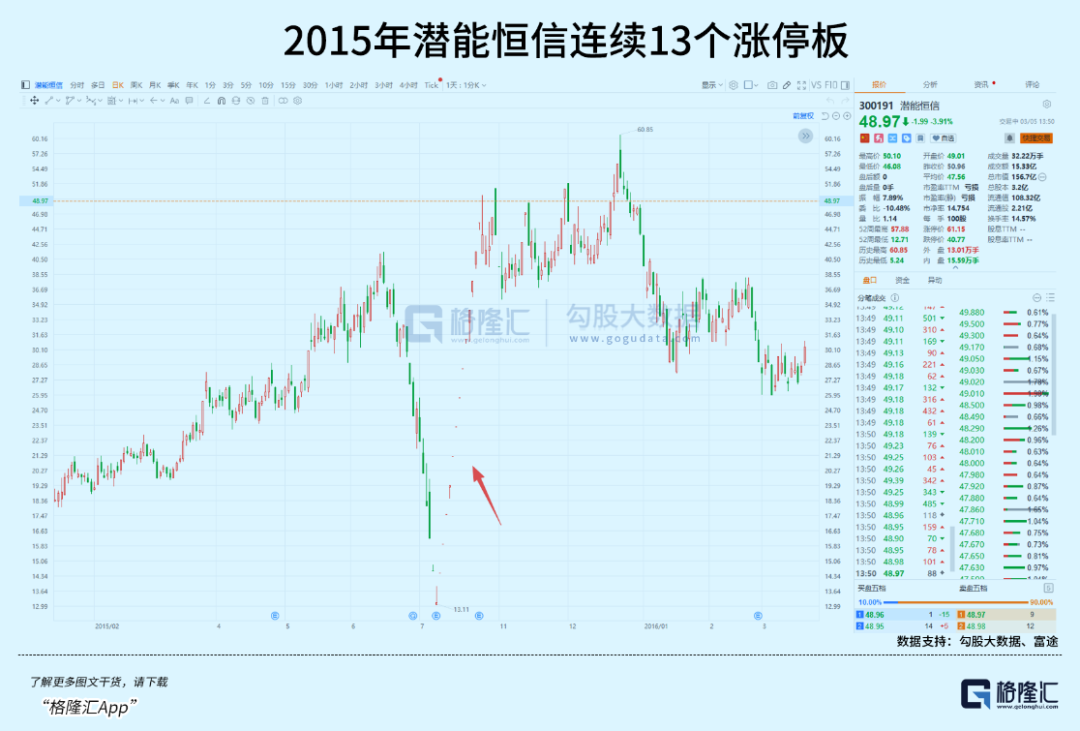 潜能恒信股价从17元低位附近启动,到3月3日强势涨停站上53元,短期涨幅高达约200%。
