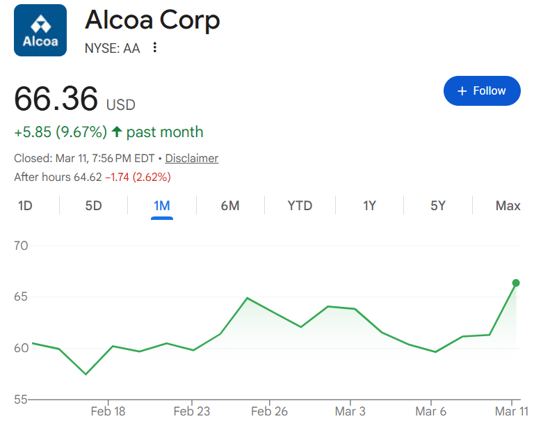 AA公司市值约为160亿美元,受铝价飙升和美国地区溢价的推动,其股价大幅上涨,目前交易价格在60美元中低段,而一年前仅为20美元出头。伊朗战争和关税上调是推动此轮上涨的主要因素,过去一年来,AA股价累计上涨约97%。