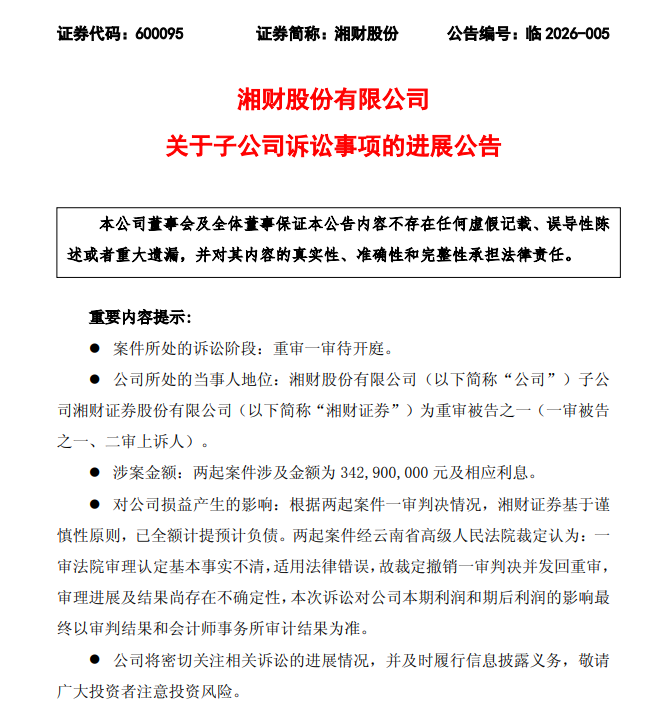 2026年2月,湘财股份发布《关于子公司诉讼事项的进展公告》,披露其子公司湘财证券涉及的两起诉讼已进入重审一审程序,案件尚未开庭审理。