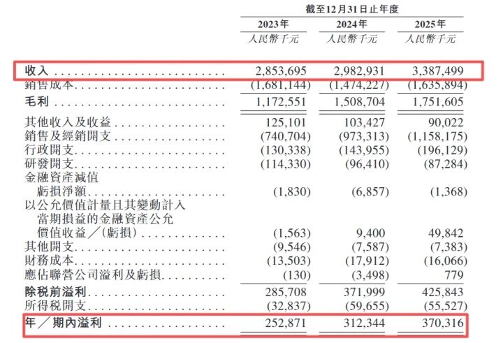 招股书显示,2023年至2025年,可孚医疗分别实现营业收入28.54亿元、29.83亿元和33.87亿元;实现归母净利润2.53亿元、3.12亿元和3.70亿元。