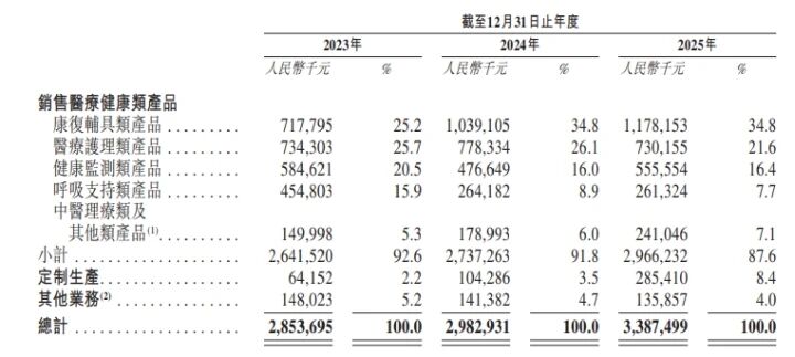 从业务结构来看,公司收入主要来源于医疗健康类产品销售。2025年,康复辅具类产品实现收入11.78亿元,占比34.8%,是公司第一大收入来源;医疗护理类产品实现收入7.30亿元,占比21.6%;健康监测类产品实现收入5.56亿元,占比16.4%;呼吸支持类产品实现收入2.61亿元,占比7.7%;中医理疗类及其他产品实现收入2.41亿元,占比7.1%。