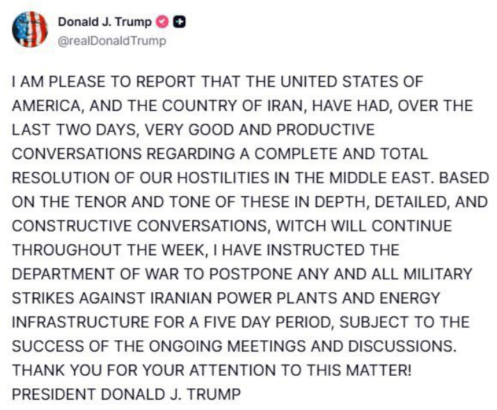 美国东部时间周一早上7点左右,特朗普在Truth Social上用全大写字母发帖称,美国和伊朗周末举行了“非常好的、富有成效的对话”,旨在“彻底解决”中东地区的敌对行动。他还下令五角大楼暂停对伊朗发电厂和能源基础设施的所有袭击,为期五天。