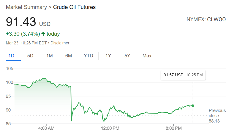 布伦特原油从每桶109美元暴跌至92美元的低点,之后有所回升,西德克萨斯中质原油触及每桶88.70美元,创下战争开始以来的最低点。