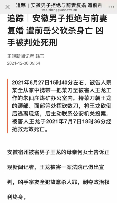 2021年12月,正观新闻发布题为《安徽男子拒绝与前妻复婚,遭前岳父砍杀身亡,凶手被判处死刑》的报道。报道依据的是宿州市中级人民法院作出的一审刑事附带民事判决书,文中也提及了“一审开庭”“当庭并未宣判”“法院已经作出判决”等时间节点。