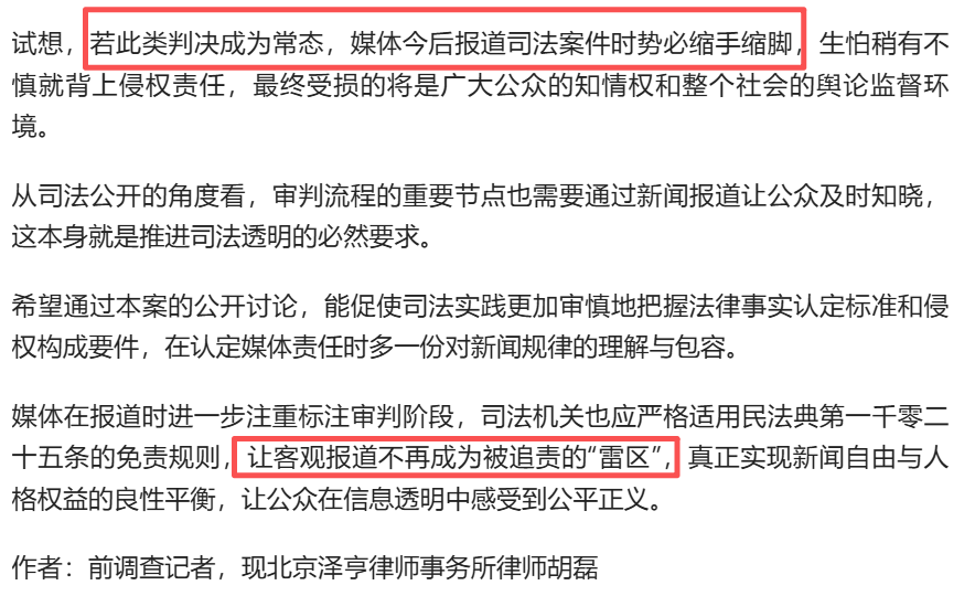 前调查记者、现北京泽亨律师事务所律师胡磊对此表示,“试想,若此类判决成为常态,媒体今后报道司法案件时势必缩手缩脚,生怕稍有不慎就背上侵权责任,最终受损的将是广大公众的知情权和整个社会的舆论监督环境。”