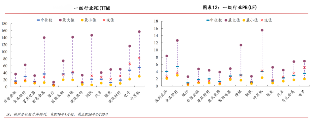 同时,从PE(TTM)看,非银金融(保险券商)、食品饮料、家电等行业当前PE处于历史较低分位,计算机、电子等行业PE处于历史较高分位。