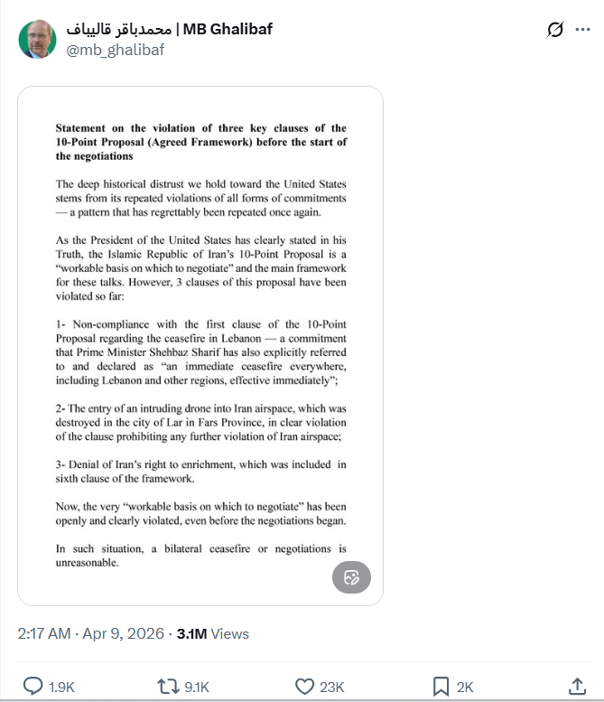 周四凌晨,伊朗议会议长穆罕默德·巴盖尔·卡利巴夫在X上发布一份英文声明,称谈判启动前的《十点倡议》中有三项关键条款遭违反。