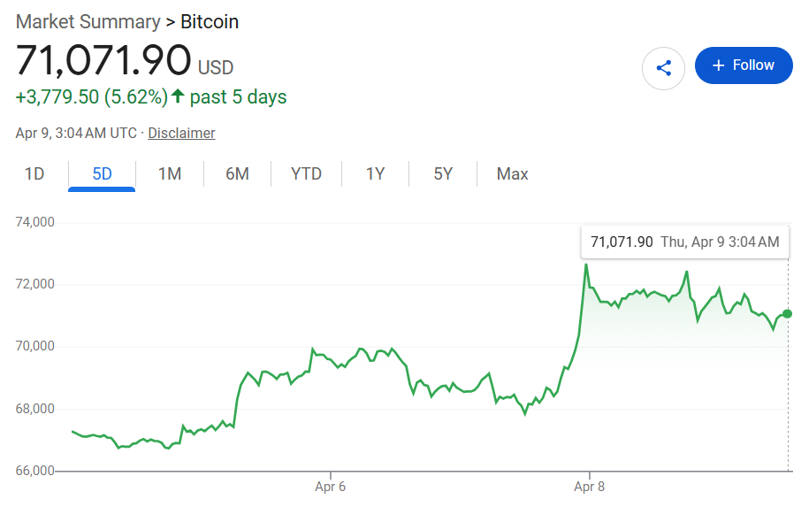 消息传出后几分钟内,主要加密货币的价格飙升。比特币(BTC-USD)上涨5%达到72,841美元,创下自3月18日以来的最高水平,之后涨幅有所回落。索拉纳(SOL-USD)和以太坊(ETH-USD)分别上涨7%和8%。