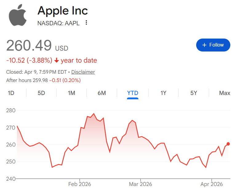 随后苹果股价有所反弹,截至周四收盘,苹果微涨0.61%,报260.49美元/股,总市值3.82亿美元。年内苹果下跌近4%。