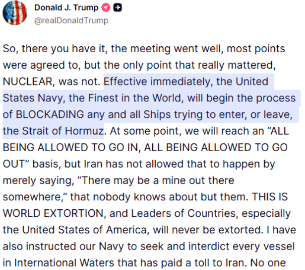 周末和平谈判结束后,人们对停止敌对行动抱有希望,但特朗普在TruthSocial上发帖宣布:“即日起,世界上最优秀的美国海军将开始封锁任何试图进入或离开霍尔木兹海峡的船只。”