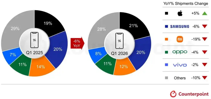全球智能手机需求的疲软成为机构看衰高通的一个主要原因。4月10日,市场调查机构CounterPoint Research所发布的报告显示,受DRAM和NAND短缺及中东局势影响,2026年第一季度全球智能手机出货量同比下降6%。除了苹果之外,三星、小米、OPPO以及vivo等安卓阵营手机品牌销量悉数下滑,这对于高通来说显然不是个好消息。