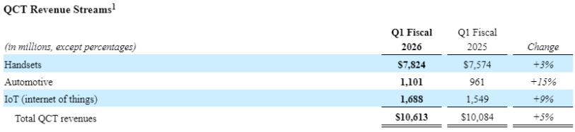 数据显示,2026财年第一财季,高通物联网业务营收17亿美元,同比增长9%;汽车芯片业务营收同比增长15%至11亿美元,单季度营收创下历史新高。另外,高通QTL业务实现营收15.9亿美元,同比增长29%,税前利润率高达77%,专利授权体系继续为高通贡献着稳定的收入以及利润。