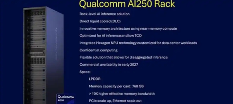 2025年10月27日,高通发布面向数据中心的下一代AI推理优化解决方案,包括基于云端AI芯片Qualcomm AI200和AI250的加速卡及机架。据悉,上述两款芯片采用高通Hexagon NPU,可搭载于一套完整的液冷式服务器机架系统中,并采用直接液冷以提高热效率。
