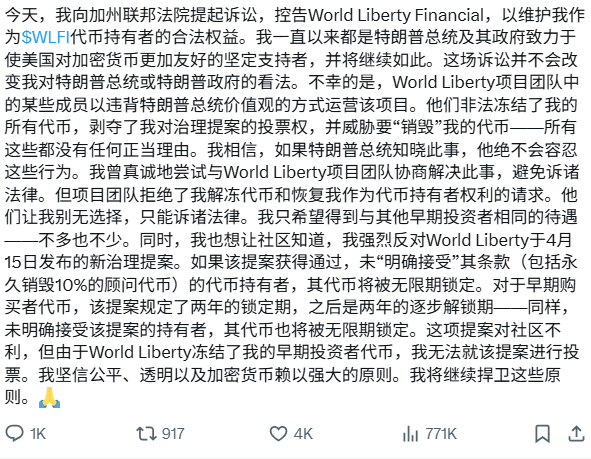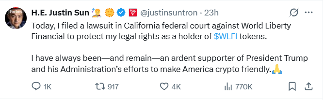 孙宇晨指出,这是为了“维护我作为$WLFI代币持有者的合法权益”。