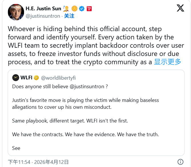 对此,孙宇晨回应称:“WLFI团队采取的每一项行动——秘密植入用户资产后门、在未披露或未经过正当程序的情况下冻结投资者资金、将加密社区当作私人提款机——都必须有人为此承担责任。作为该项目的最大投资者,我要求所有责任人公开姓名,而不是躲在暗处。”